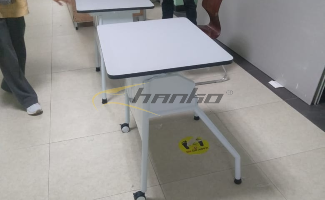 Meja Sekolah Korea Custom Hanko dengan menggunakan bahan multiplek yang dilapisi HPL pada bagian top table dan juga rangka menggunakan besi hollo bulat yang di cat powder coating.